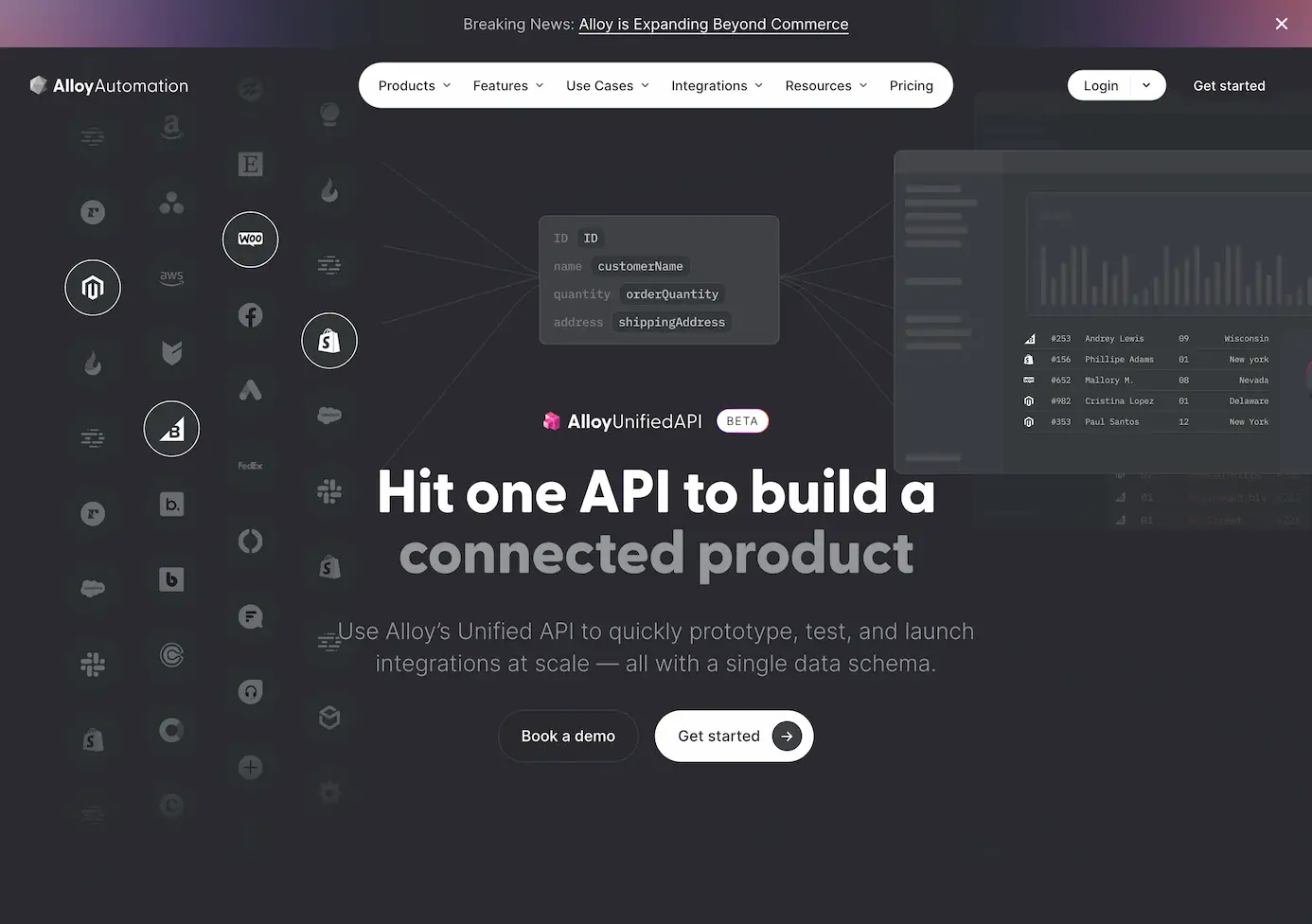 Alloy Automation-Hit one API to build a connected product Use Alloy’s Unified API to quickly prototype, test, and launch integrations at scale — all with a single data schema.