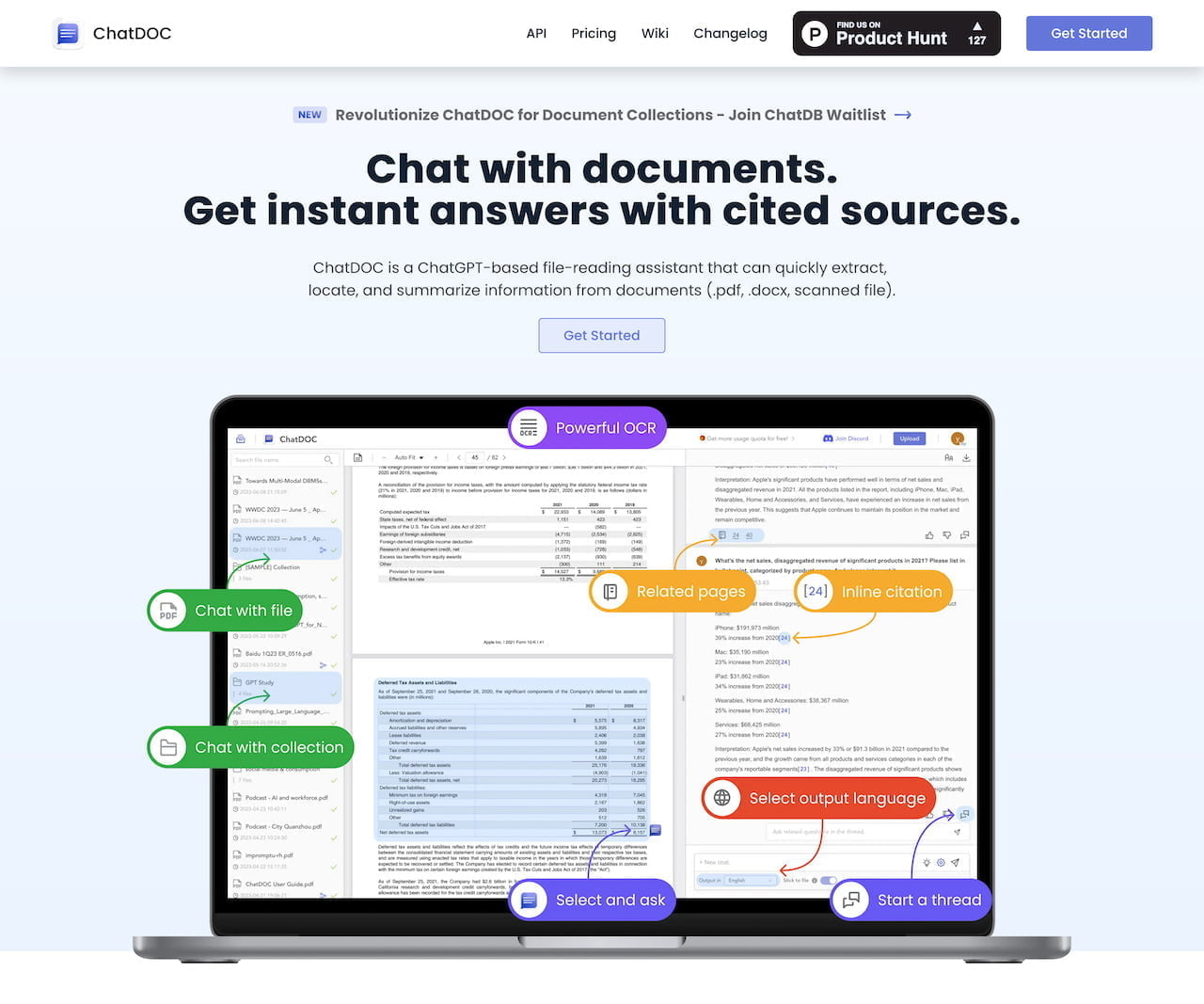 4. ChatDOC - Product Information, Latest Updates, and More This is a page on Product Hunt that provides information about ChatDOC as a file-reading assistant. It highlights the ability to ask questions, receive instant answers with cited sources, and select specific tables or texts for targeted inquiries.