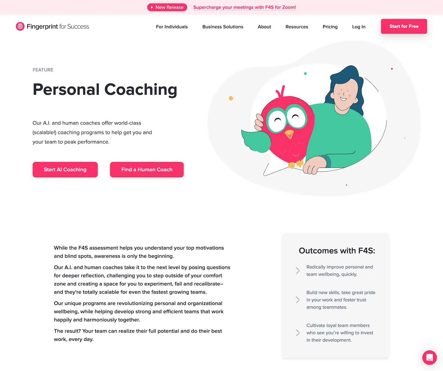 Fingerprint for Success (F4S) is a pioneering performance and collaboration platform that seamlessly melds AI technology with human coaching. The platform's innovative approach focuses on offering tailored online coaching to both individuals and teams, aiming to optimize performance in diverse areas of life and work.