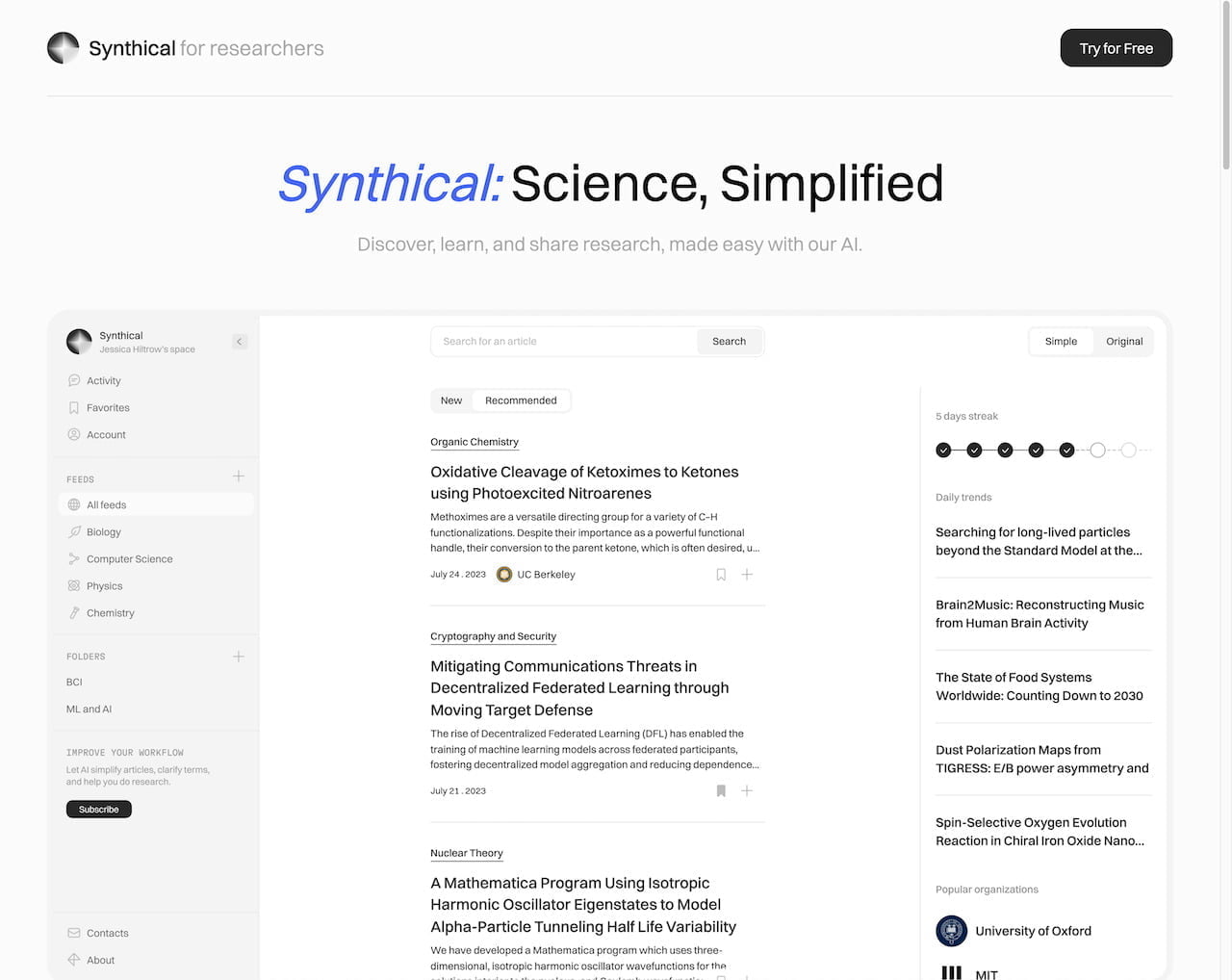 Synthical provides a combination of AI-powered research, seamless collaboration features, and a vast repository of open science articles. It's designed with researchers in mind to simplify and enhance your work process.