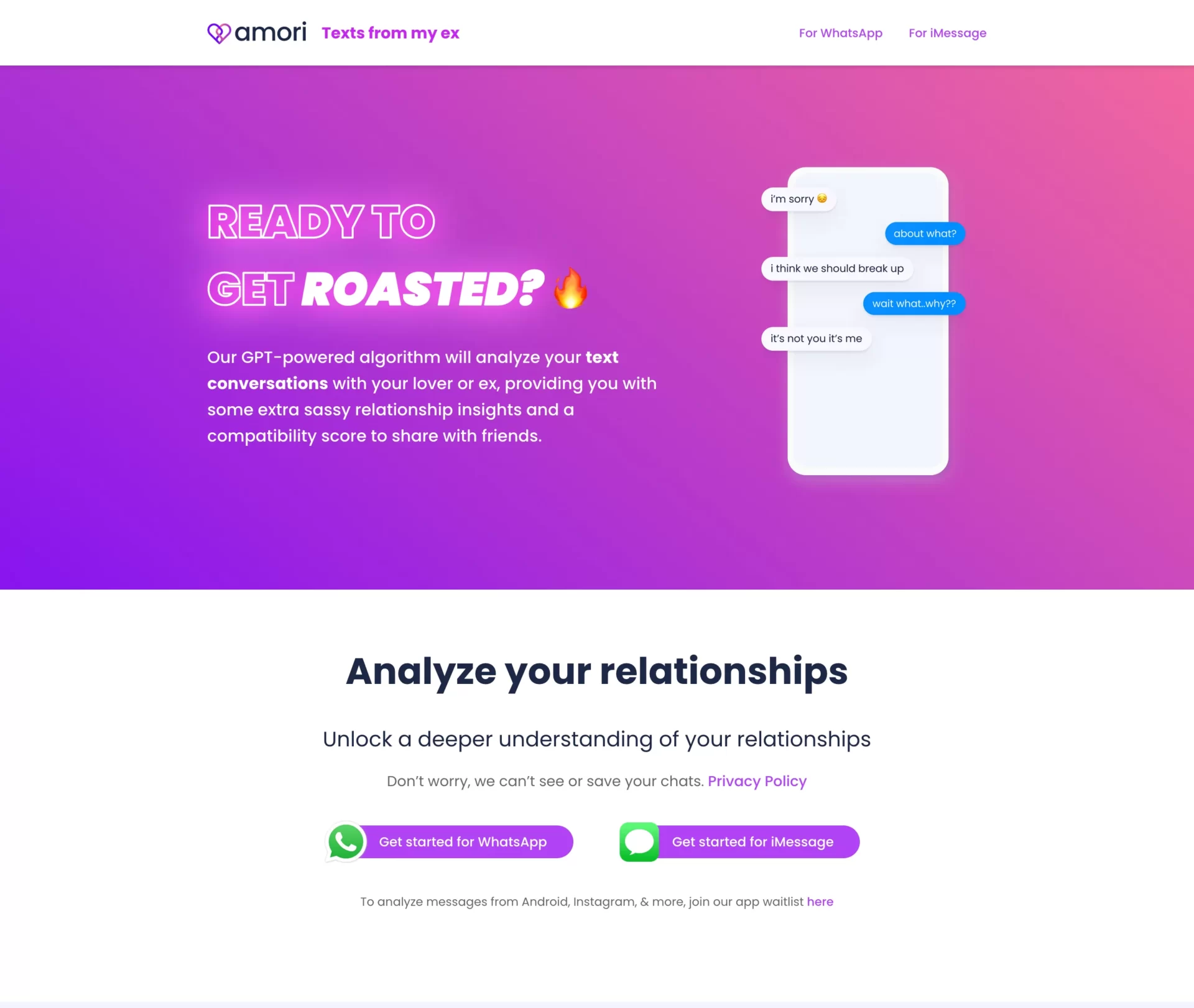 Texts From My Ex is an innovative platform that employs a GPT-powered algorithm to analyze text conversations between individuals and their partners or exes. This AI-powered tool offers users deeper insights into their relationships by providing a sassy and often brutally honest assessment of their interactions. The service supports both WhatsApp and iMessage conversations, enabling users to export their chat history and upload it for analysis. Upon analysis, users receive a compatibility percentage that indicates the emotional complexity and compatibility of their relationship.Introduction to Texts From My Ex