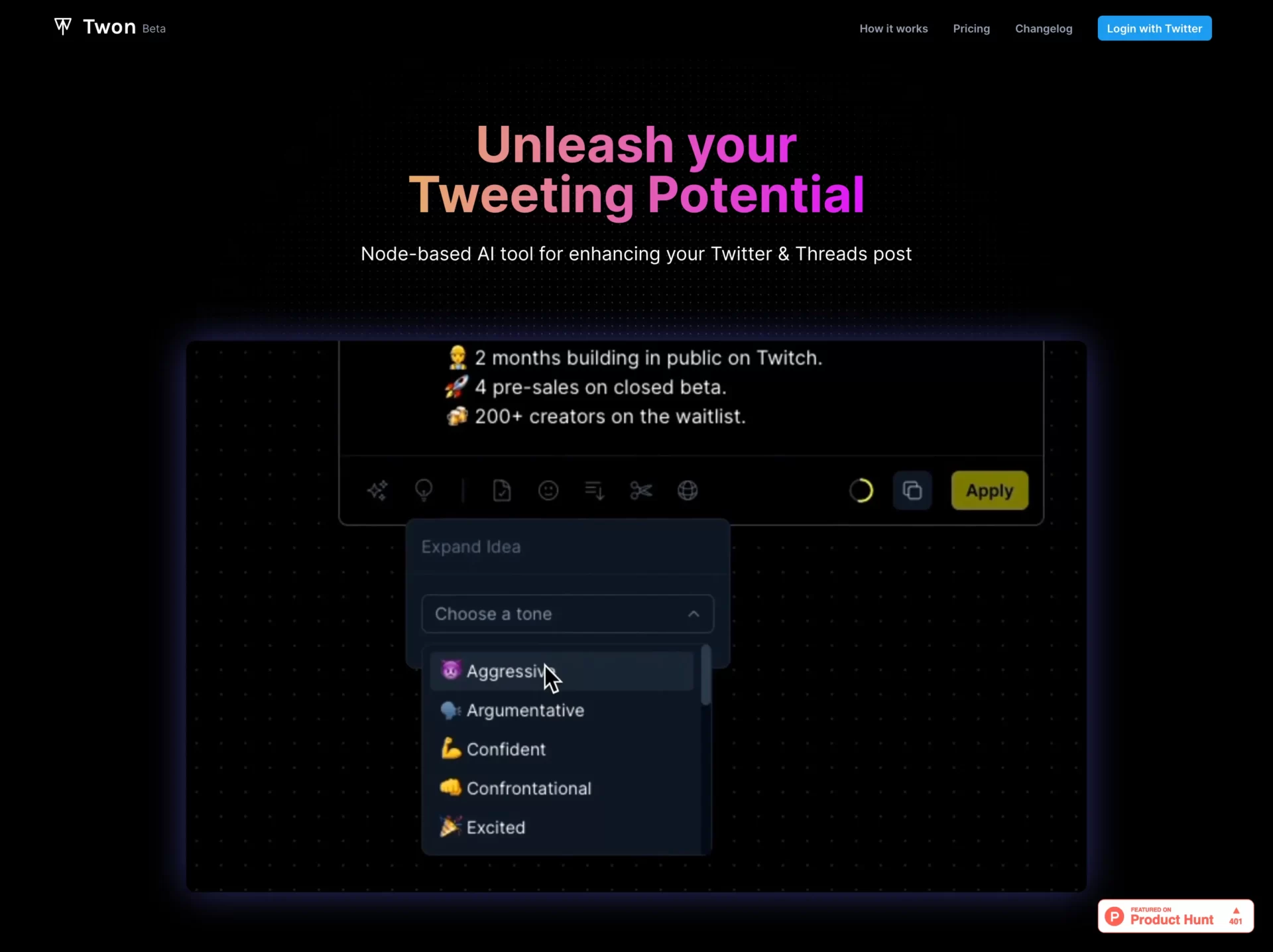 Twon is an AI-tool designed to enhance Twitter (X) and Threads posts, providing users with endless post variations in minutes. Utilizing Node-based technology. Twon helps users explore and optimize their content effectively, promising a seamless and organic writing process.